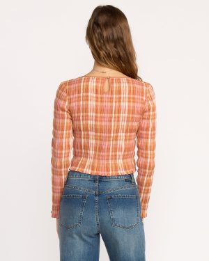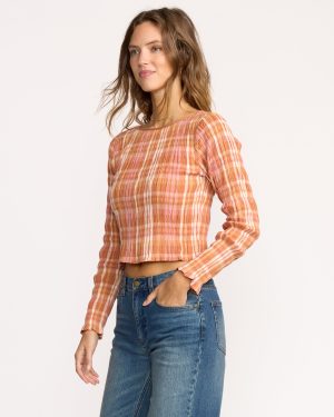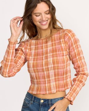 Our form-fitting crop top brings attitude with textured yarn-dye fabric and all-over smocking. The boat neckline and long sleeves create a sleek silhouette. while cotton-stretch blend keeps you comfortable. Featured here in the Orange colorway.