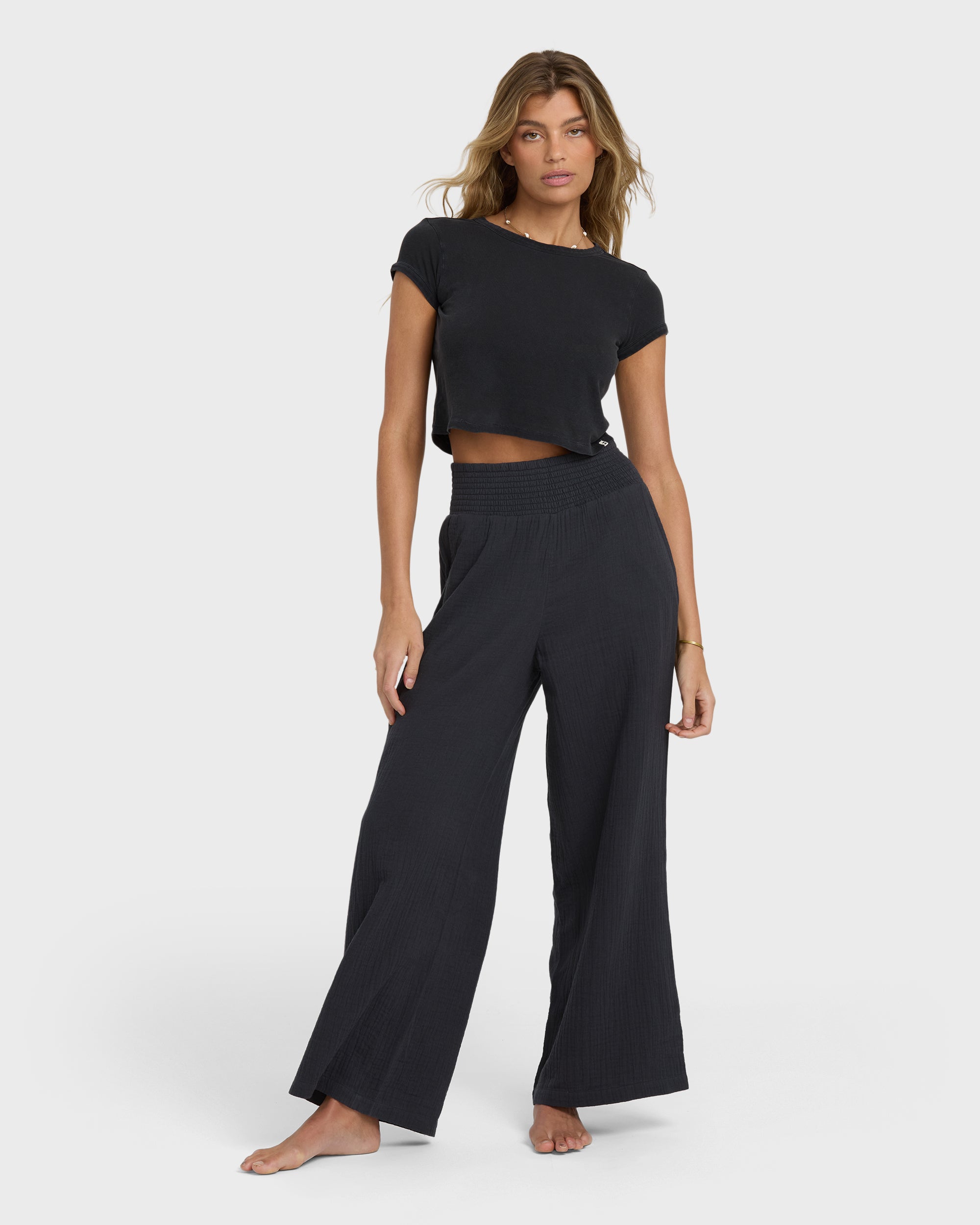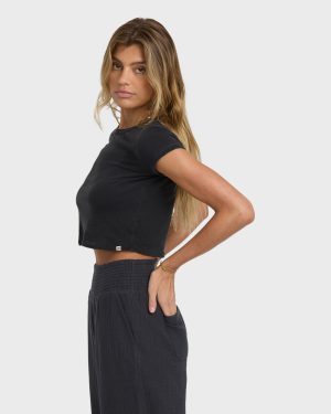 Slip into the Daily. a knit top crafted with 87% cotton and 13% partially recycled cotton jersey. With a specialty dye. rib bindings. and metal plate. this top puts ‘effortless’ in style. Featured here in the Black Sands colorway.