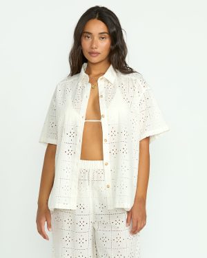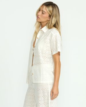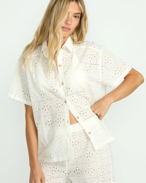 Our 100% cotton eyelet coverup top is oversized bliss. With short sleeves and a button-down closure. breezy yet structured. this women’s shirt is ultra-lightweight. breathable perfection to throw on over swimwear or keep cool in casual style. In crisp white eyelet. it’s a breath of fresh air.