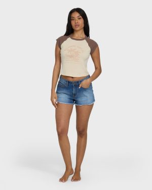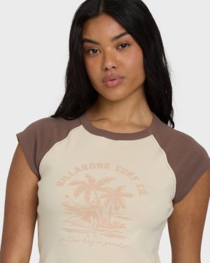 Our Paradise Raglan Short Sleeve T-Shirt combines fitted raglan sleeves with pure cotton comfort. The screenprinted design and signature clip label add a laid-back vibe to this essential knit top. Featured here in the Brown colorway.