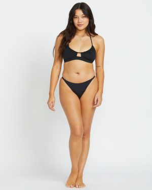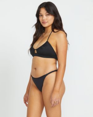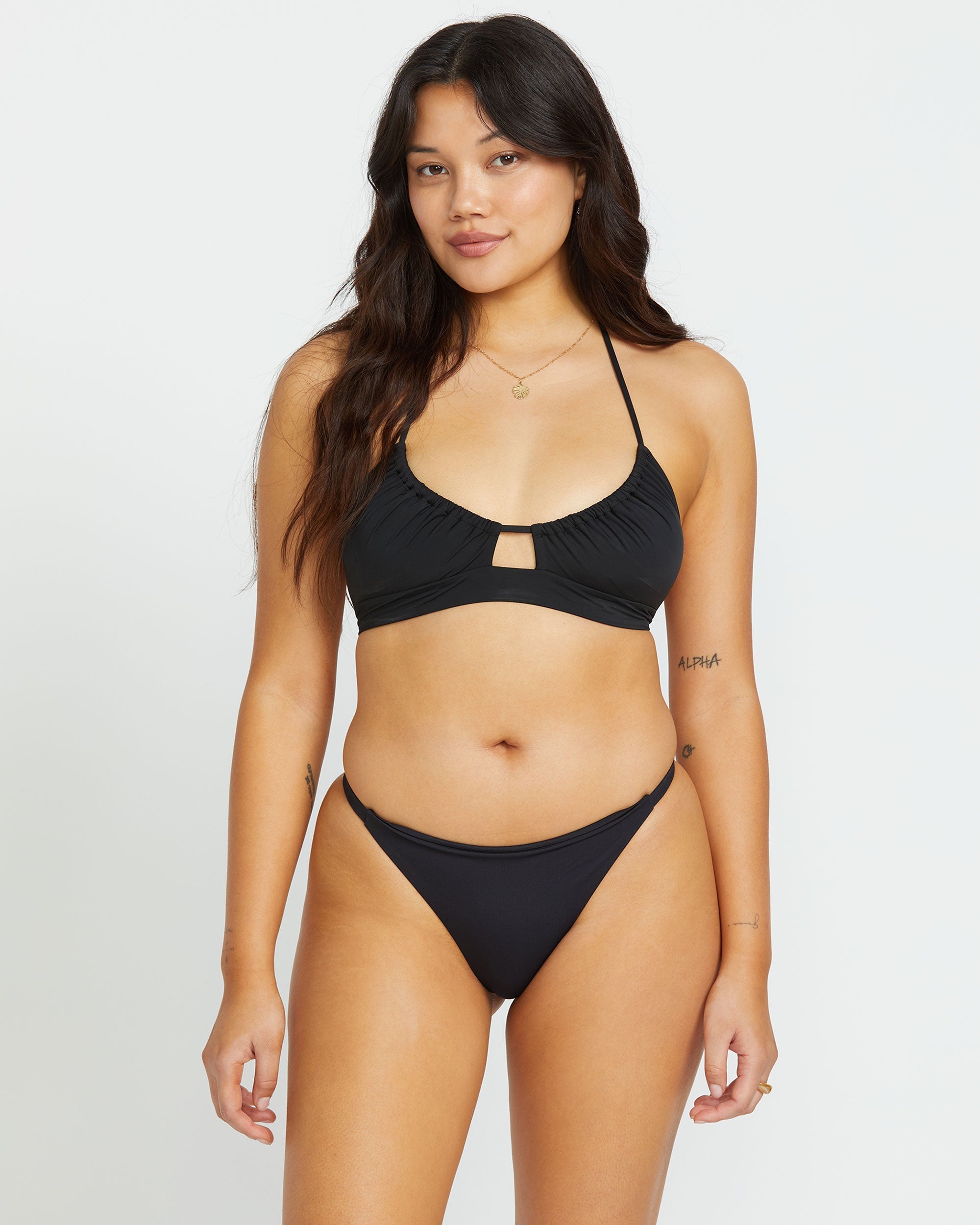 This cheeky bikini bottom’s partially recycled stretch blend hugs curves. Adjustable high or low rise cut with embroidered logo offers just-peachy coverage. Featured here in the Black Pebble colorway.