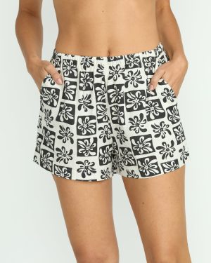 Catch rays in breezy comfort with these cotton sun fade printed shorts. Crafted from soft. lightweight cotton with a printed crosshatch pattern. the relaxed fit and elastic waistband keep you feeling cool. Side pockets and a 2.5 inseam add flirty flair to the flattering warm-weather silhouette. Featured here in the Black Sands colorway.